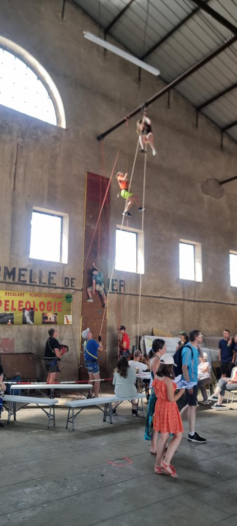 Dimanche 22 juin, nous étions 12 présents pour animer l’atelier et les 3 voies. Ce sont un peu plus de 50 personnes (majoritairement en enfants de 7 à 14 ans) qui sont venues s’essayer à comparer la progression sur corde et sur paroi. Bilan : c’est plus facile avec les techniques spéléologiques de monter jusqu’en haut ;-).