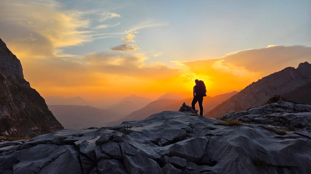 Le soleil rasant nous offre de somptueux paysages avant d’entamer le raide pierrier menant au lac. Nous arrivons pile à temps pour ne pas sortir les frontales. Pierre, Mathias et Delphine partent faire trempette dans le lac. Pendant ce temps Charles, Paul et moi-même, installons les tarps (ou bâches) en prévision d’une averse la nuit. Nous bivouaquons un peu plus haut sur un beau plateau herbeux, la vue est à couper le souffle. Les trois barjos étant revenus (je cite : « vous auriez dû venir elle n’était pas si froide… »), nous attaquons le repas, profitons du ciel dégagé pour observer quelques belles étoiles filantes puis ne traînons pas trop pour nous glisser dans nos sacs de couchage respectifs. La courte nuit de la veille et les quelques 1 200 m de dénivelée positive cumulée du jour nous facilitent grandement à la fermeture des paupières.