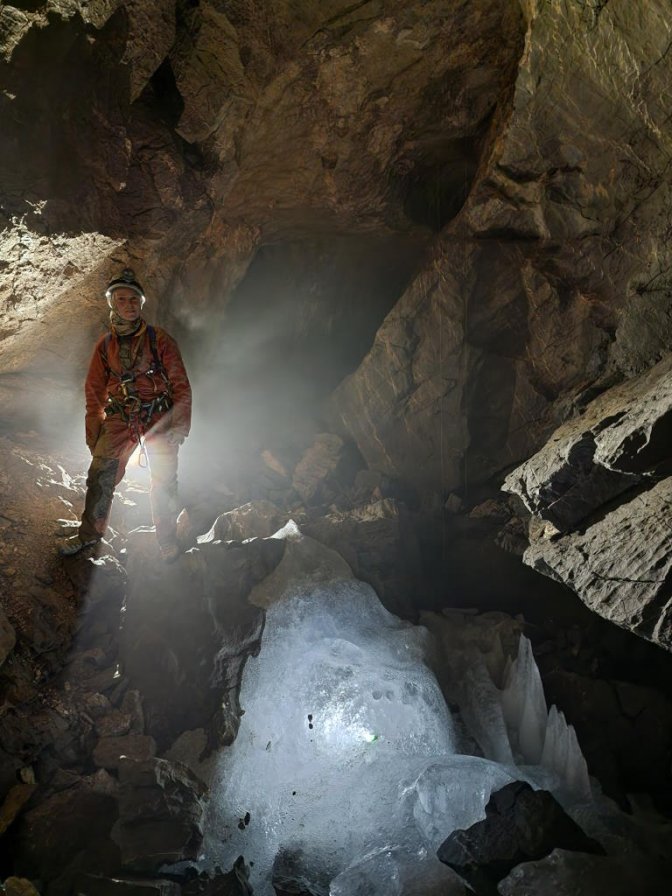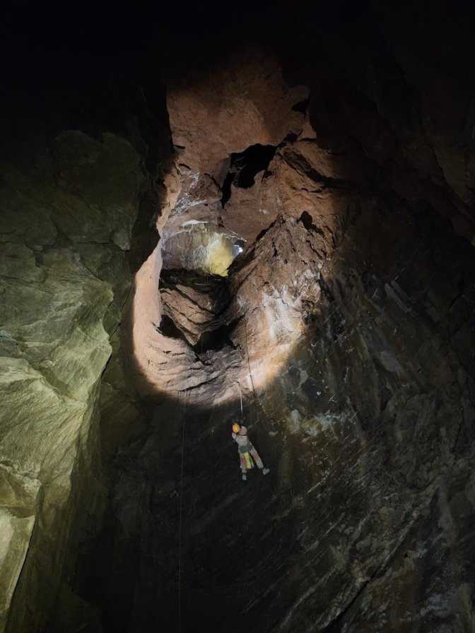 Bien que les premières lueurs du soleil apparaissent vers 6 h le réveil se fera plus tardivement. Certains ont eu un peu froid cette nuit mais tous semblent contents de l’expérience. Après un petit-déjeuner copieux nous remballons et redescendons au V4 où nous arrivons pour 11 h 30. Seuls Charles et moi sommes déjà venus sur le massif, mais le souffle glacial s’échappant de l’entrée nous accorde tous à dire qu’il est préférable de manger dehors. Paul découvre totalement la discipline, nous lui montrons l’équipement dont il aura besoin puis entrons sous terre. La salle Delacourt dispose tout juste d’une petite plaque de glace. Xavier m’avait informé de cela, mais je m’attendais tout de même à en voir un peu plus. Pierre et Mathias descendent la première verticale puis vient le tour de Paul. Nos explications et encouragements ne suffiront pas, il ne se sent pas à l’aise dans le milieu et préfère en rester là pour l’expérience. Il aura au moins essayé, l’activité ne peut pas plaire à tout le monde et cela ne sert pas à grand-chose de le forcer davantage. Il rebrousse les quelques mètres de galerie tandis que le reste de l’équipe poursuit sa descente en direction du puits des Savoyards. Nous empruntons la main courante aérienne permettant d’arriver dans le réseau de la Pierre qui Tombe puis remontons la galerie des Stalactites et sa magnifique conduite forcée. Le passage permettant de rejoindre le sommet de la galerie n’est pas équipé, je repasse en tête pour escalader le premier et y mettre un bout de cordelette. Les deux trous laissés pour les Pulses ne me sont pas de grande utilité, un AN plus loin me permet d’amarrer la corde, un kit sera nécessaire pour éviter le frottement sur la roche.