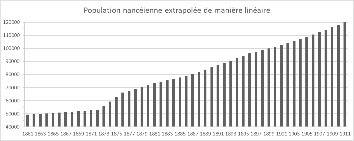 Ces taux annuels moyens permettent d’extrapoler de manière linéaire la population nancéienne sur chaque année sur la période étudiée. Le graphique obtenu permet de visualiser très clairement le bond lié à l’augmentation de population entre 1872 et 1876 puis une progression plus régulière, mais moins intense, durant les 35 années qui suivent. L’essentiel de cette augmentation de population de Nancy peut s’expliquer par deux phénomènes :